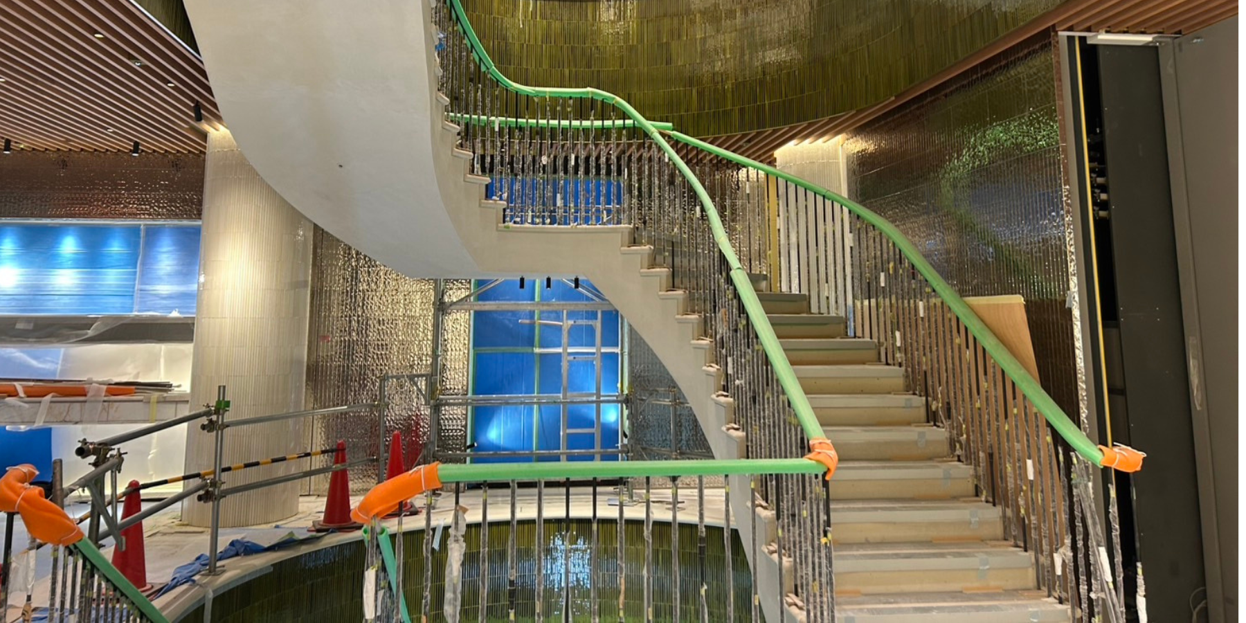 当社では、曲線壁やR天井、段差・折上天井、高天井などのデザイン内装をはじめ、防音・耐火・耐震といった性能を重視した特殊仕様の軽天工事および、それに伴うボード特殊施工まで一貫して対応しています。複雑な構造や厳しい施工条件下でも、軽量鉄骨下地の組み方、ボードの割り付けや目地位置、ビスピッチまで細かく管理し、歪みのない下地と美しい仕上がりを実現します。