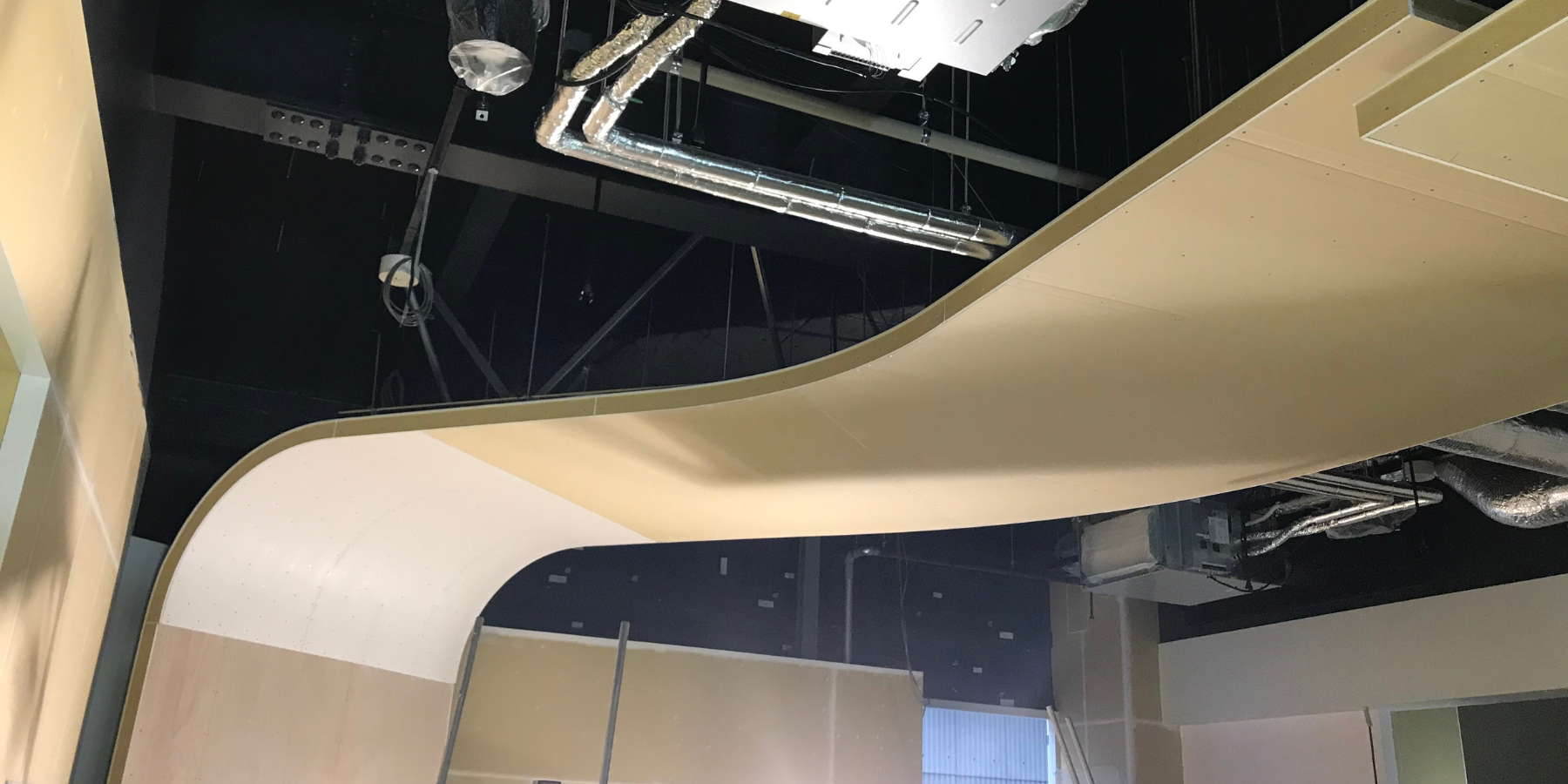 曲線壁(R壁)・R天井・折上天井・段差天井・高天井などの意匠性の高い軽量鉄骨下地工事をはじめ、防音・耐火・耐震性能を考慮した特殊仕様の下地構成にも対応しています。